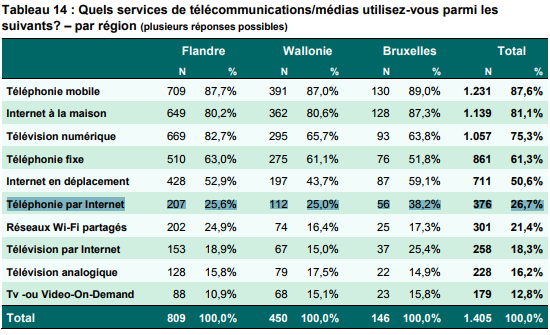 plus de 81,1 % de la population belge utilise Internet à la maison mais seulement 26,7% utilise la téléphonie par Internet alors que 61,3% des ménages utilise un téléphone fixe.