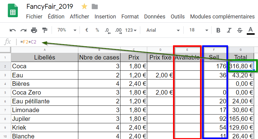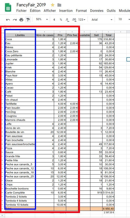 J’ai créé cette GoogleSheet afin de répondre à un besoin spécifique, comment améliorer la gestion de la caisse (pour les commandes de boissons et nourritures) lors de la Fancy Fair de l’école.