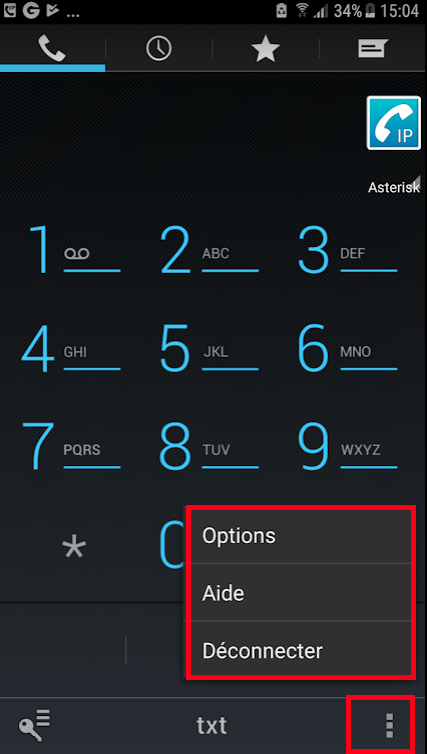 Sur cet écran, en haut à droite du clavier numérique, on peut voir que l’application est connectée à un compte nommé « Asterisk », chez vous vous devriez voir un triangle d’attention avec l’inscription inactif.