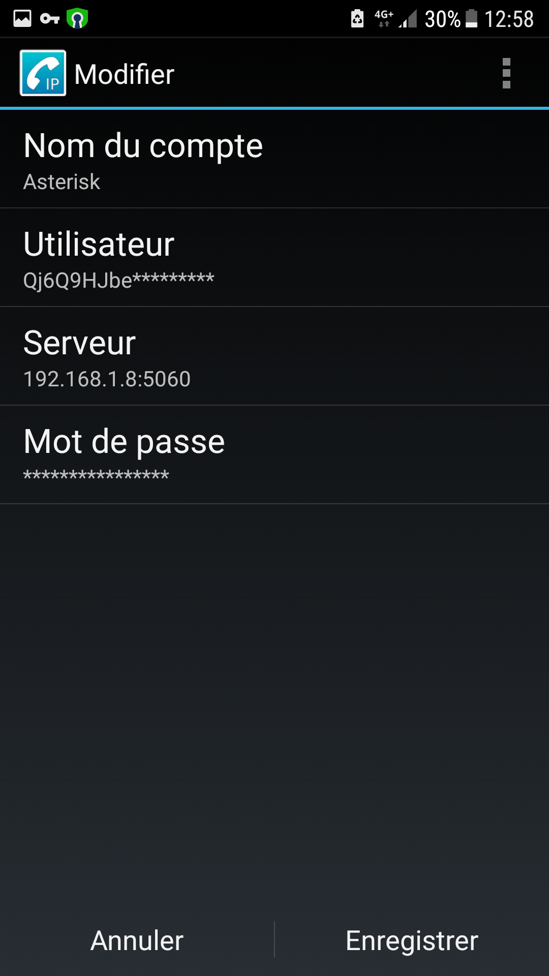 - un compte que j’ai nommé « Asterisk » qui comme son nom l’indique se connecte à mon serveur Asterisk.