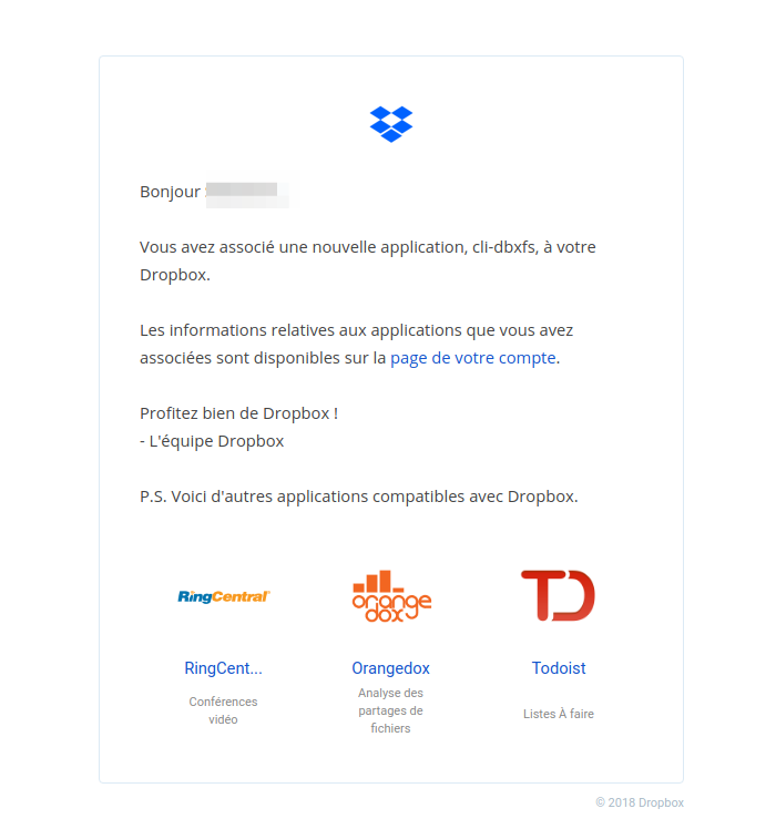 Une fois que vous avez autorisez l’accès pour l’application dbxfs, vous recevrez un mail similaire au suivant: