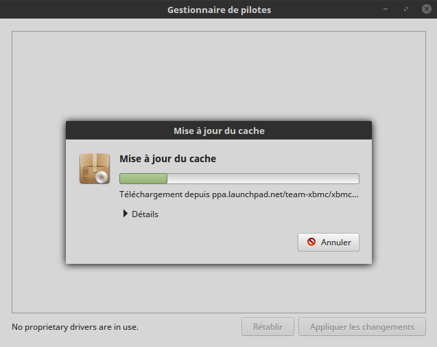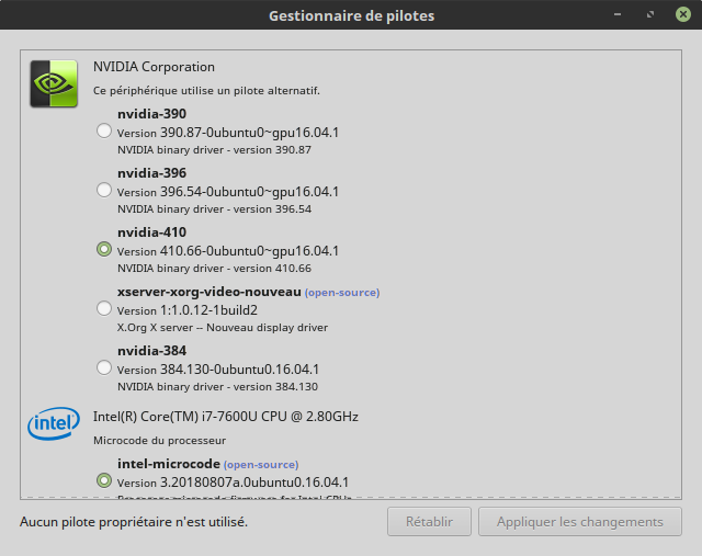 Une fois que vous avez ajouté le ppa, une autre option pour installer les drivers est d’utiliser le « gestionnaire des pilotes », ceci vous permet également de vérifier quelle version tourne actuellement.